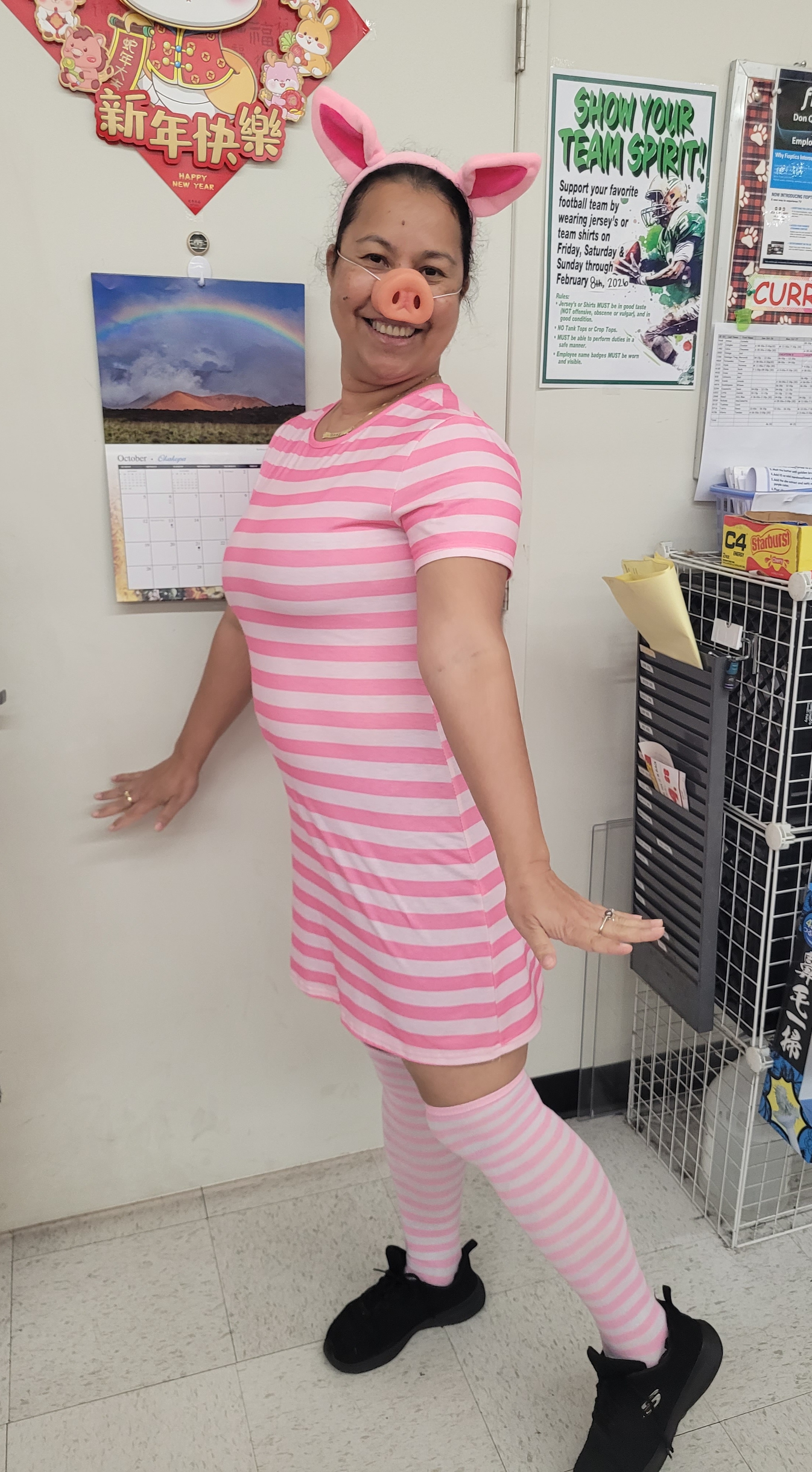 Description: Pink striped dress and socks, piglet ears & nose